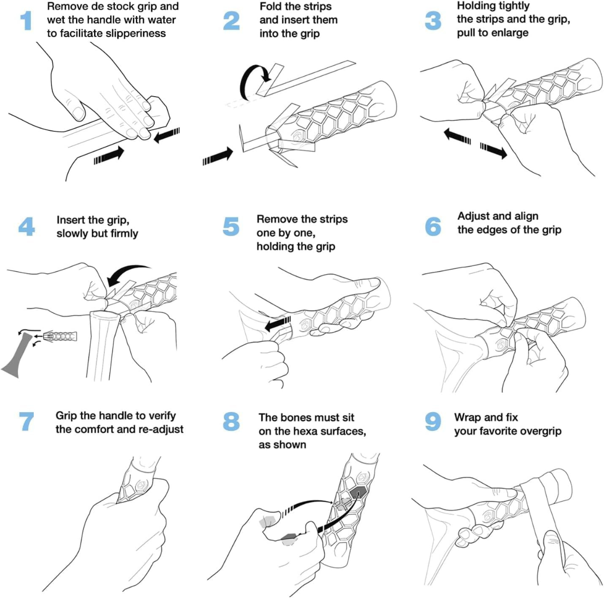 Schuif de Hesacore Hexagrip over het handvat van je racket. De honingraatstructuur moet stevig aansluiten op het handvat. Zorg dat hij volledig over het handvat zit en recht gepositioneerd is.